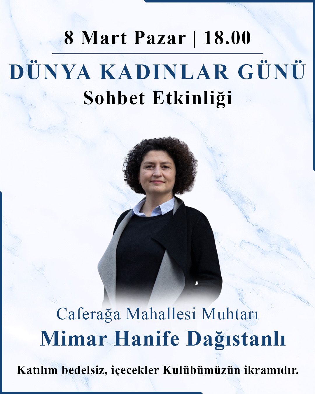 8 Mart Dünya Kadınlar Günü kapsamında, Caferağa Mahallesi Muhtarı Mimar Hanife Dağıstanlı’nın katılımıyla gerçekleştireceğimiz sohbet etkinliğimize davetlisiniz..