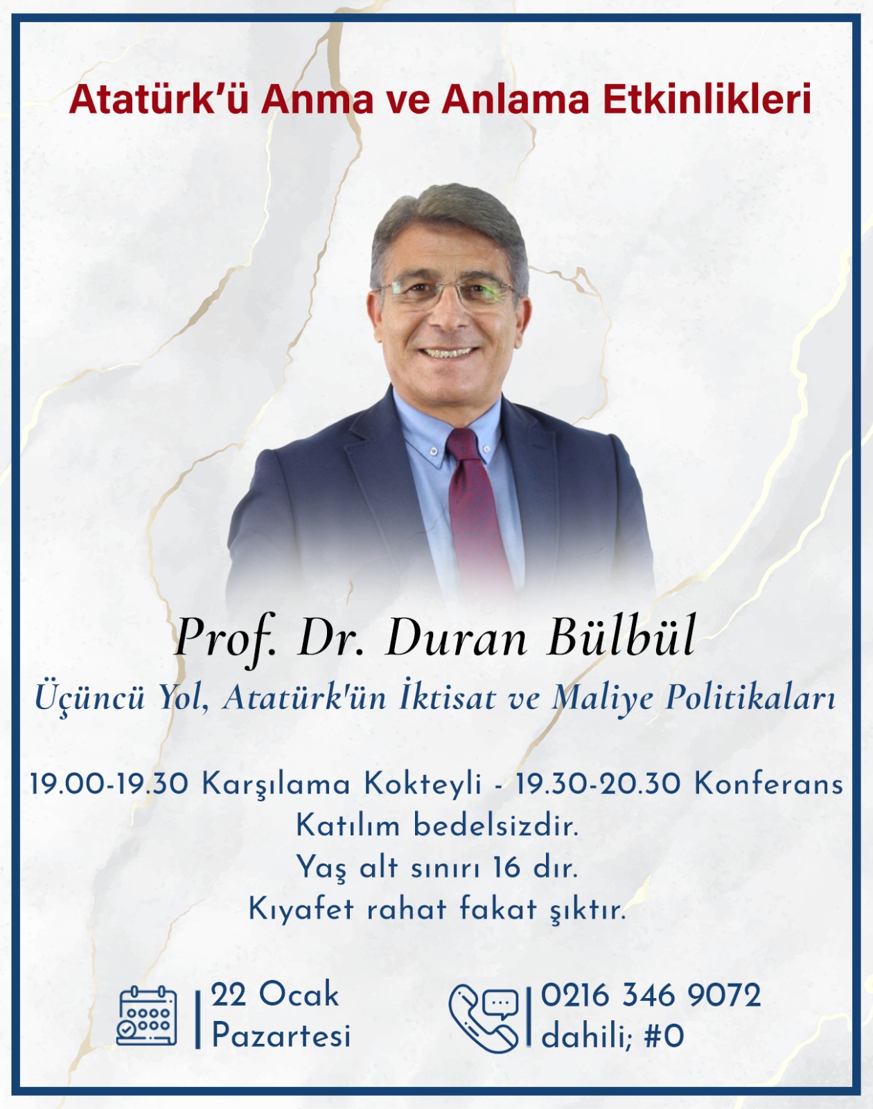 Prof. Dr. Duran Bülbül ''Üçüncü Yol, Atatürk’ün İktisat ve Maliye Politikaları'' konferansı ile 22 Ocak'da sizlerle..