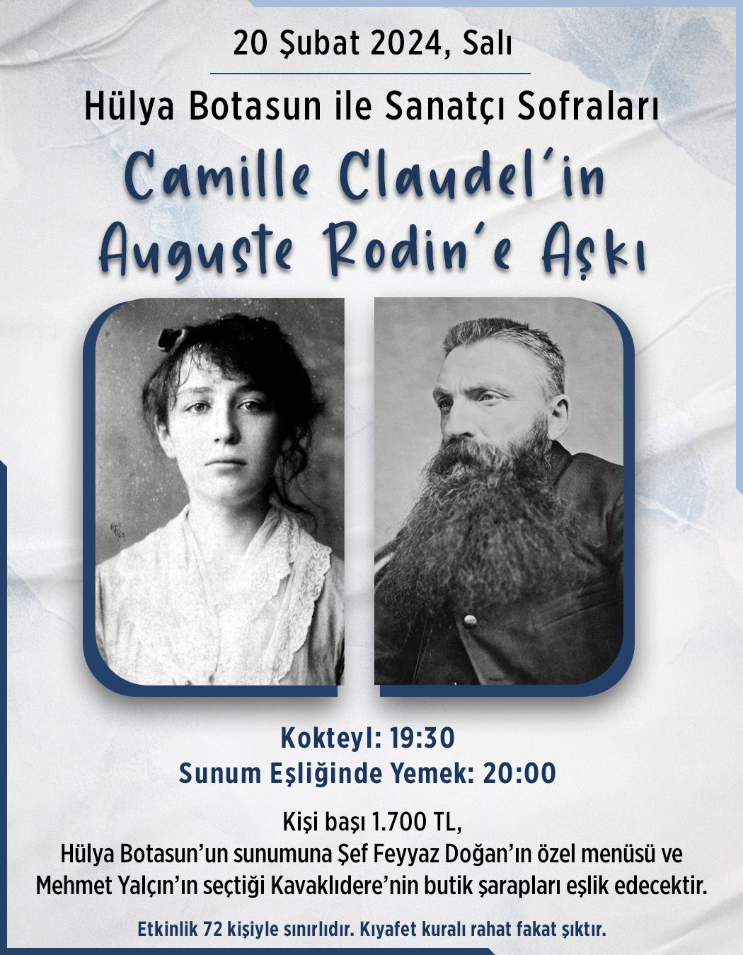 20 Şubat Salı akşamı Hülya Botasun ile Sanatçı Sofraları ''Camille Claudel’in Auguste Rodin’e aşkı'' etkinliğimize bekliyoruz..