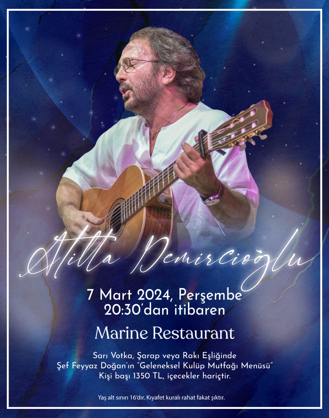 7 Mart Perşembe akşamı Atilla Demircioğlu sizlerle... Son içki sipariş saati :01.30 Hizmet birim kapanış saati: 02.00