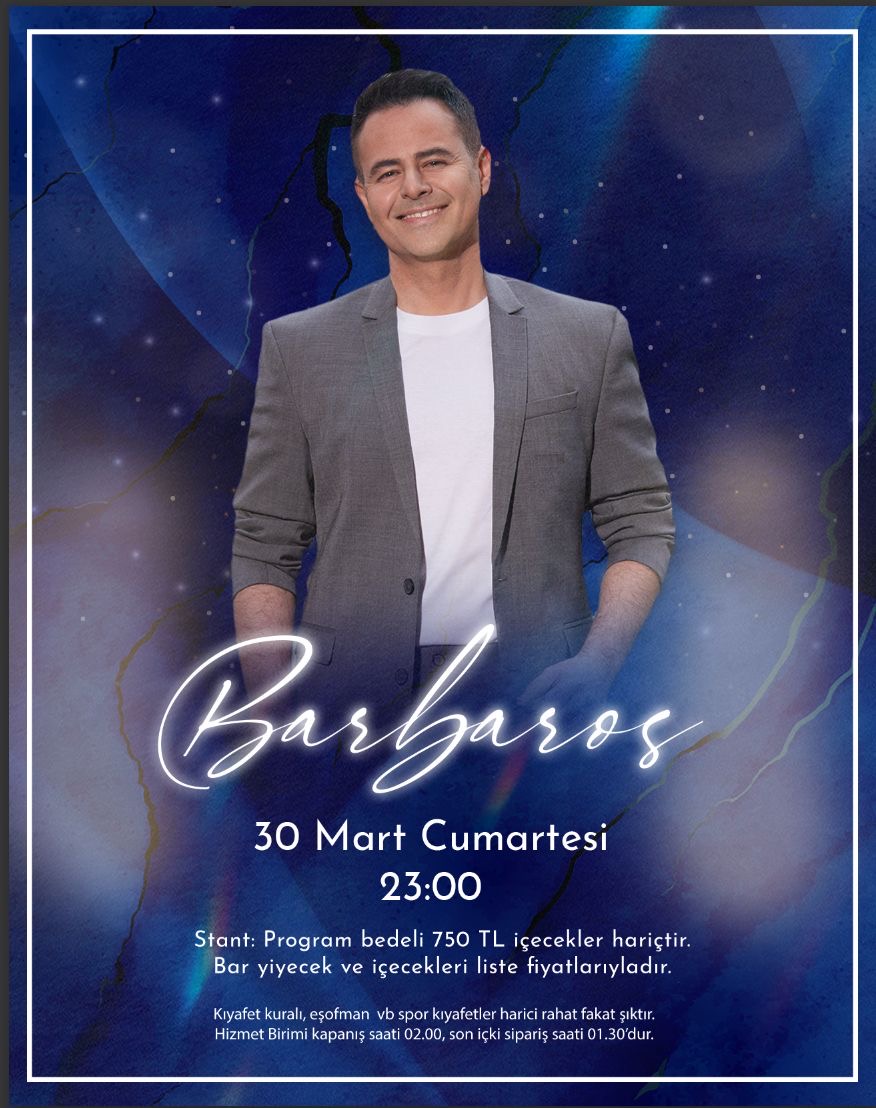 30 Mart Cumartesi akşamı Barbaros sizlerle... Son İçki Sipariş Saati 01.30 Hizmet Birim Kapanış Saati 02.00