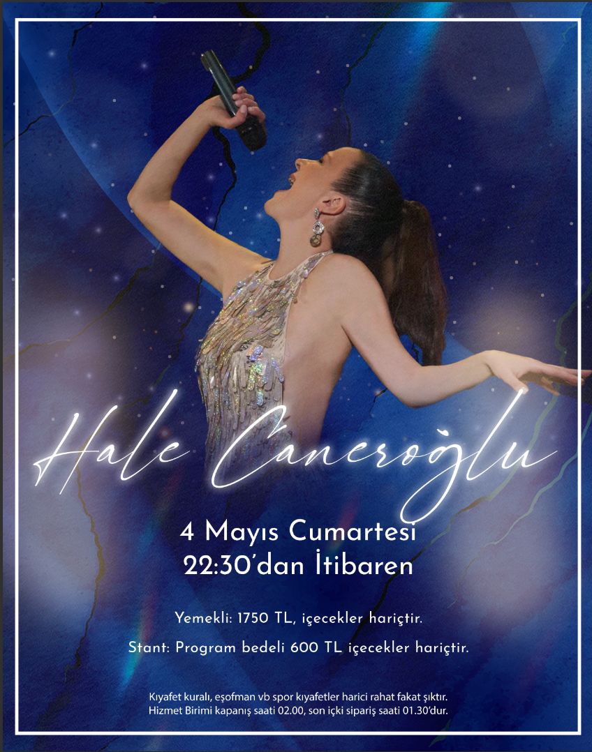 04 Mayıs Cumartesi akşamı Hale Caneroğlu sizlerle.. Son İçki Sipariş Saati 01.30 Hizmet Birim Kapanış Saati 02.00
