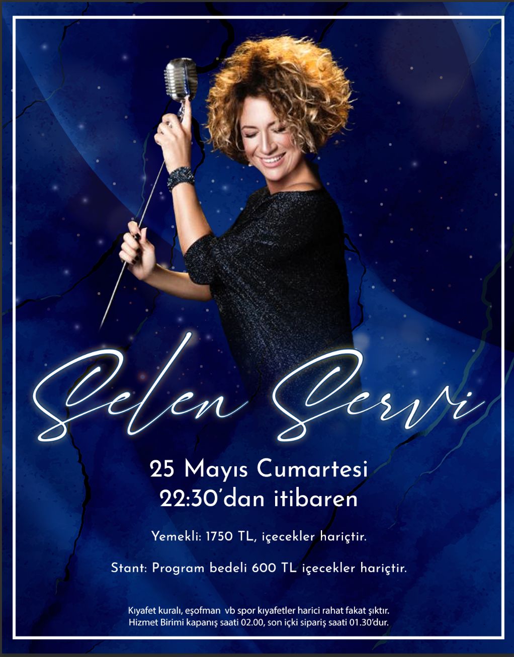 25 Mayıs Cumartesi akşamı Selen Selvi sizlerle.. Son İçki Sipariş Saati 01.30 Hizmet Birim Kapanış Saati 02.00
