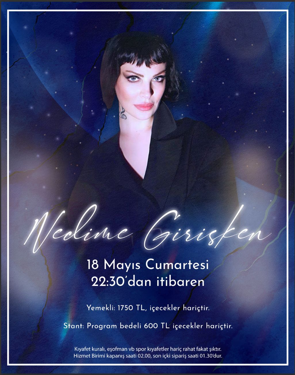 18 Mayıs Cumartesi akşamı Nedime Girişken sizlerle.. Son İçki Sipariş Saati 01.30 Hizmet Birim Kapanış Saati 02.00
