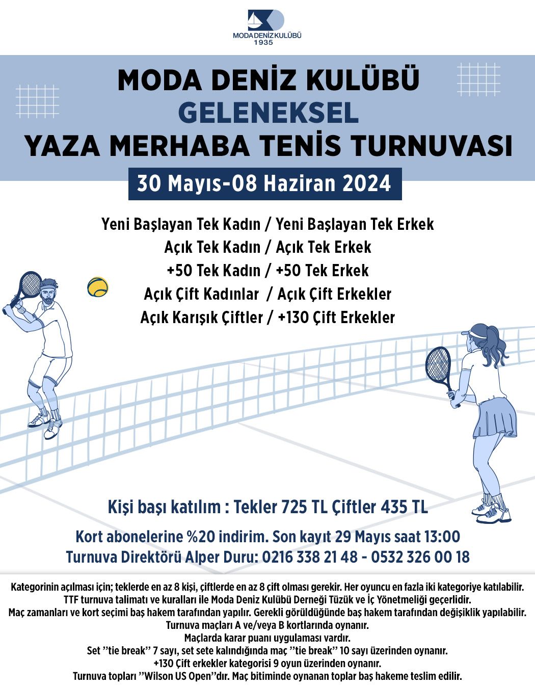 30 Mayıs-8 Haziran günleri arası Geleneksel Yaza Merhaba Tenis Turnuvamıza bekliyoruz..
